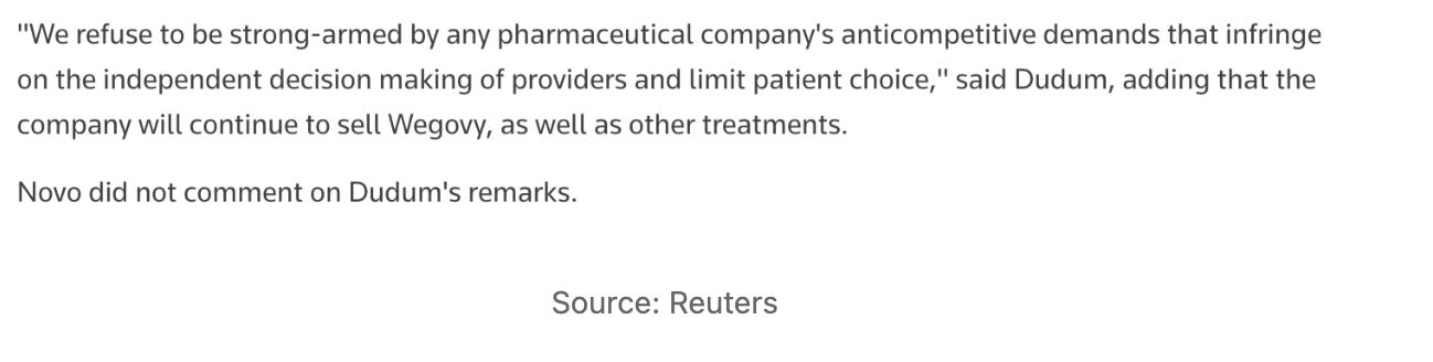 The PR Vacuum. Perhaps the most telling detail is the lack of crisis management. In major Reuters reports where HIMS CEO was openly accusing Novo of pressure, Novo’s side was conspicuously absent “No comment.”